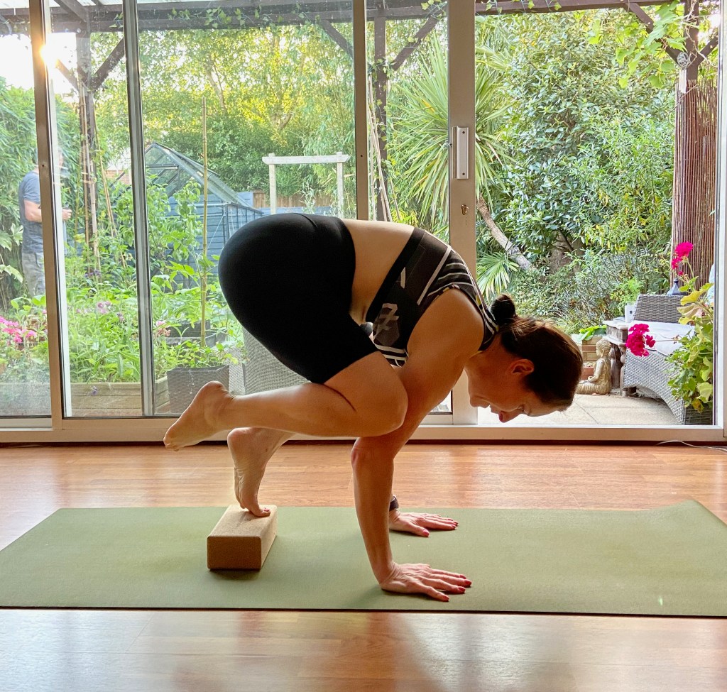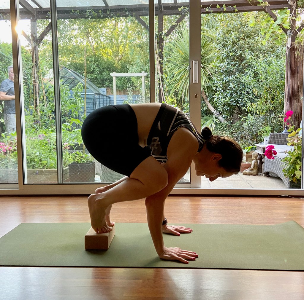 If you’re unable to get onto the floor, you can try Chair Crow. Placing the feet on a block allows the knees to lift onto the upper arms. Again, making sure you’re using your arms, knees and core abdominals here will mean you’re experiencing the pose fully.