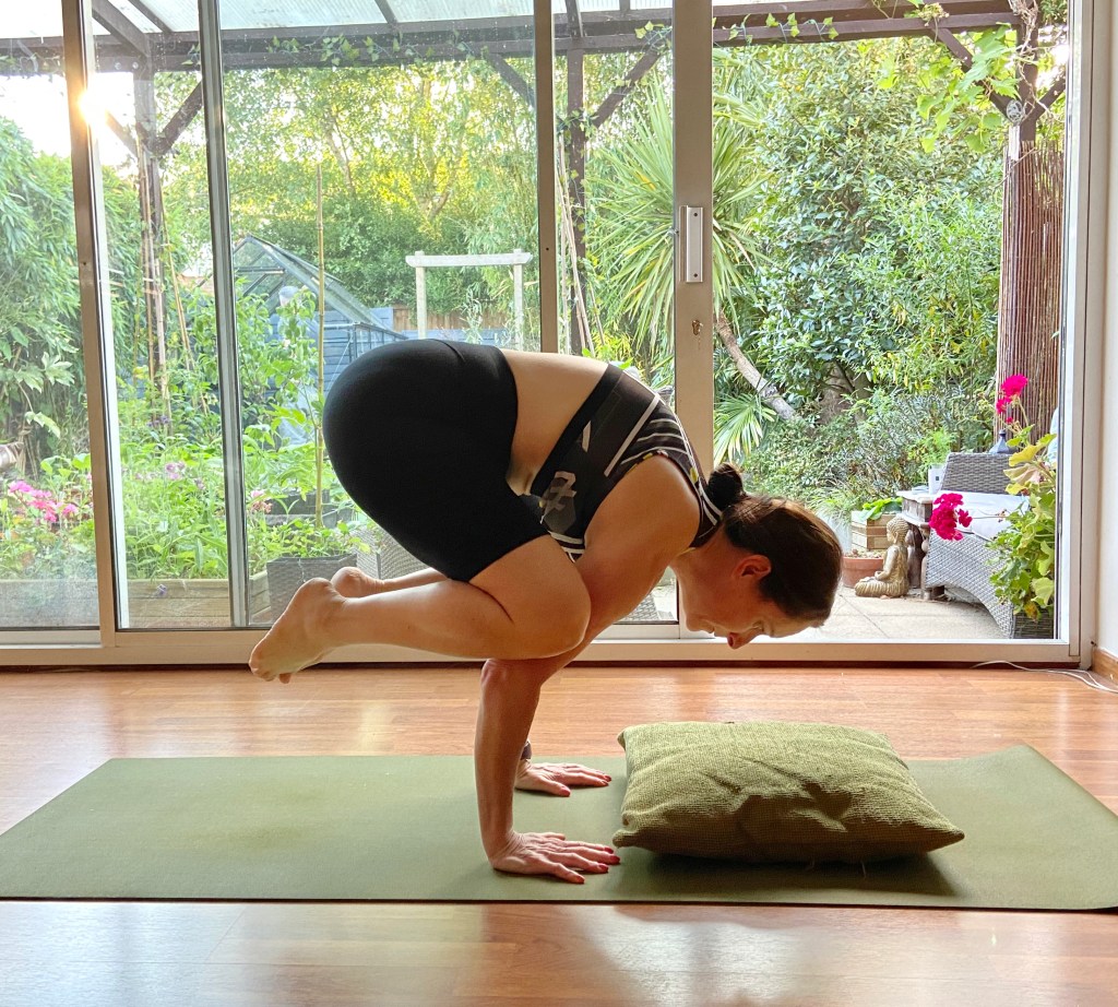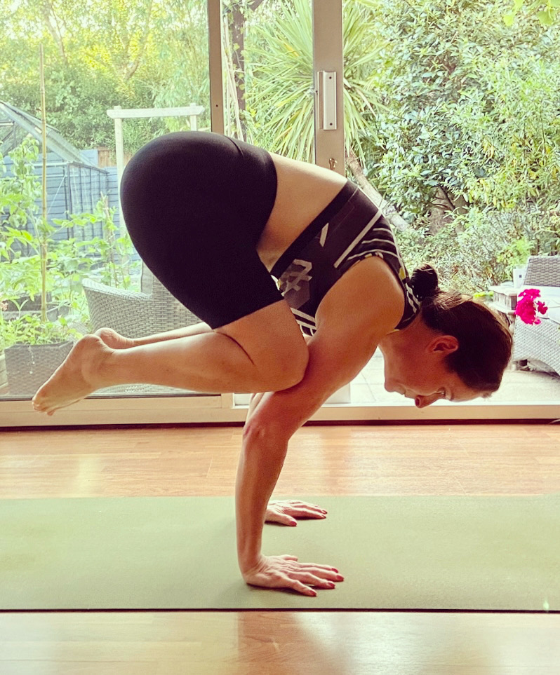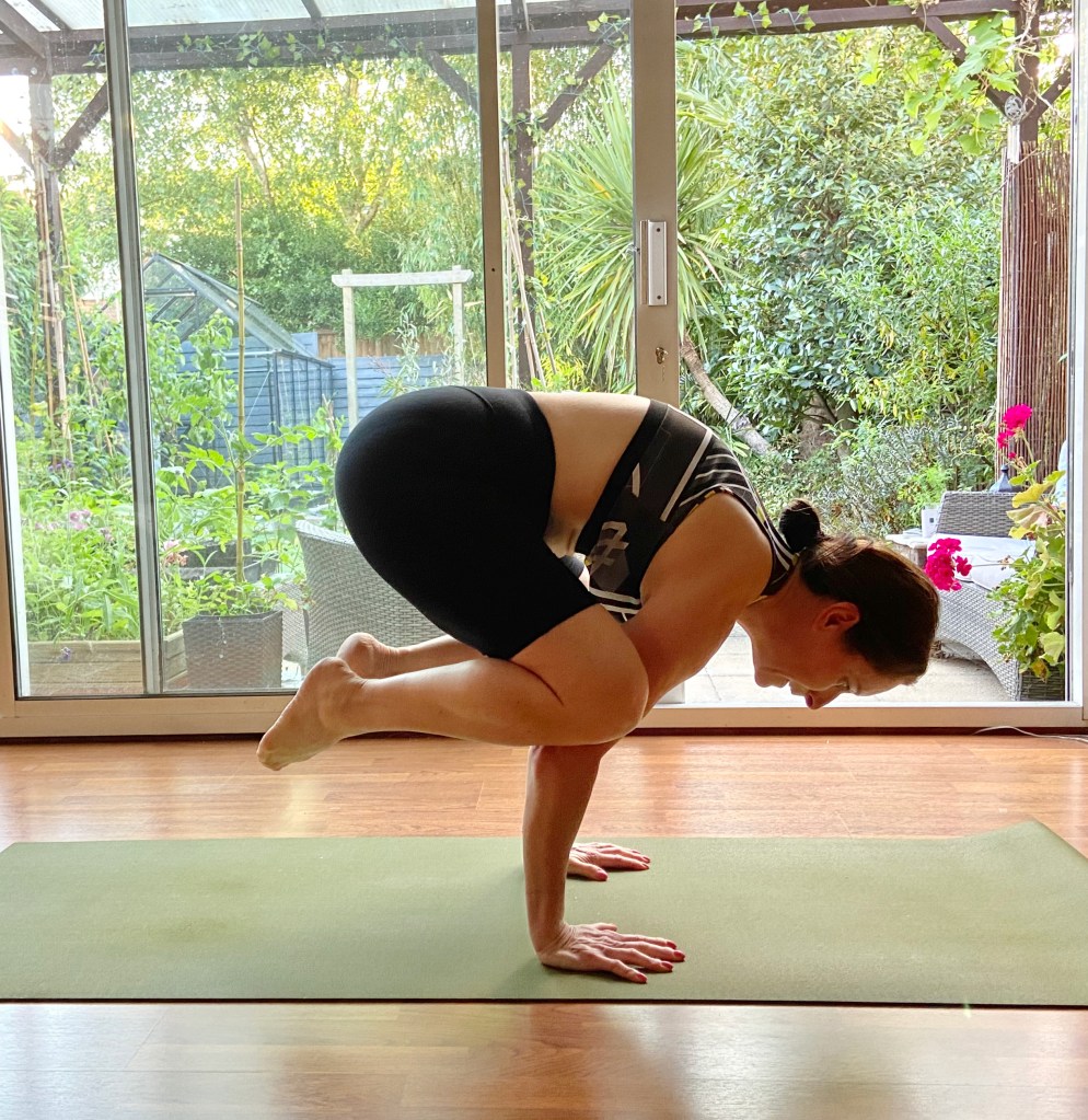You may be asked to look forwards in Crow pose – however if your bottom is slightly higher up or if you have neck issues that may not be possible. I’m looking down in these images, as that is the position I need to be in to balance. I would instead think about moving the upper body forwards and lifting your body upwards. It’s as if you’re taking flight off of a branch!
